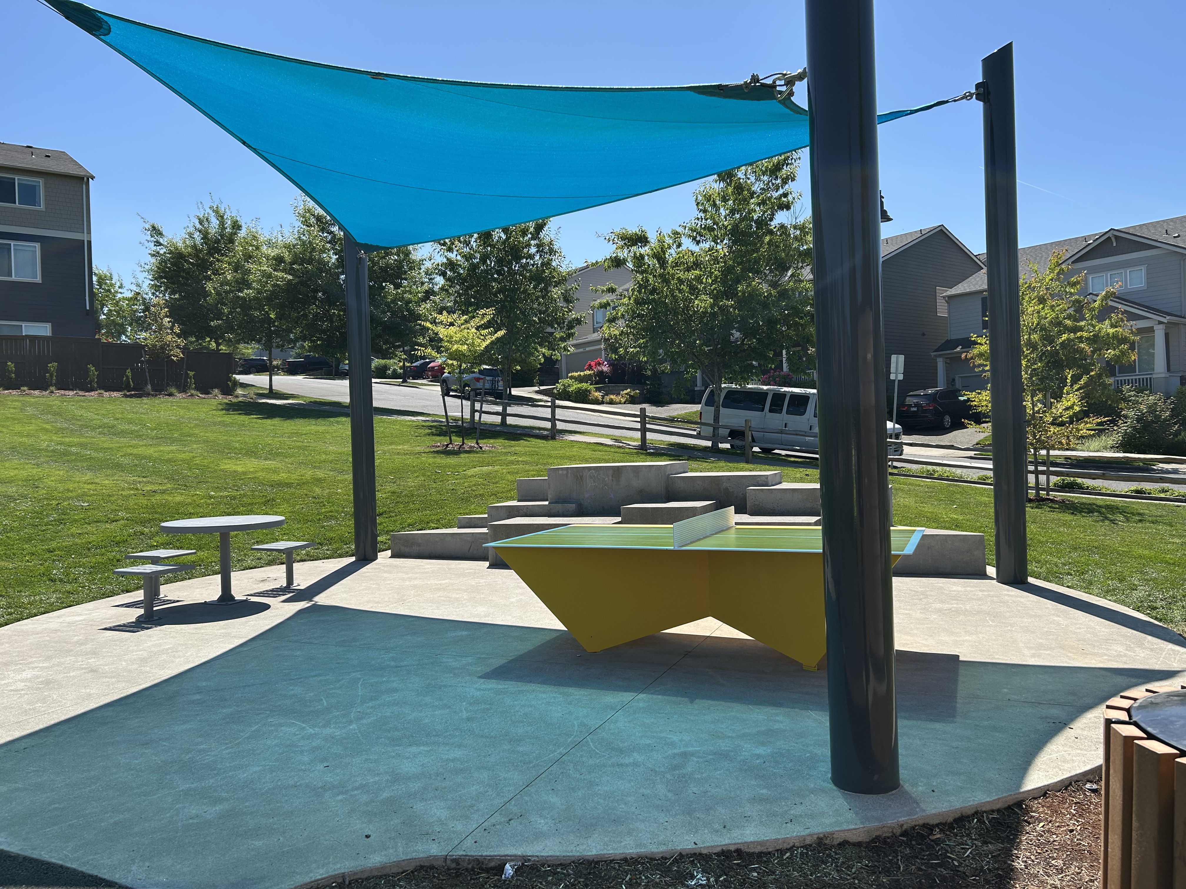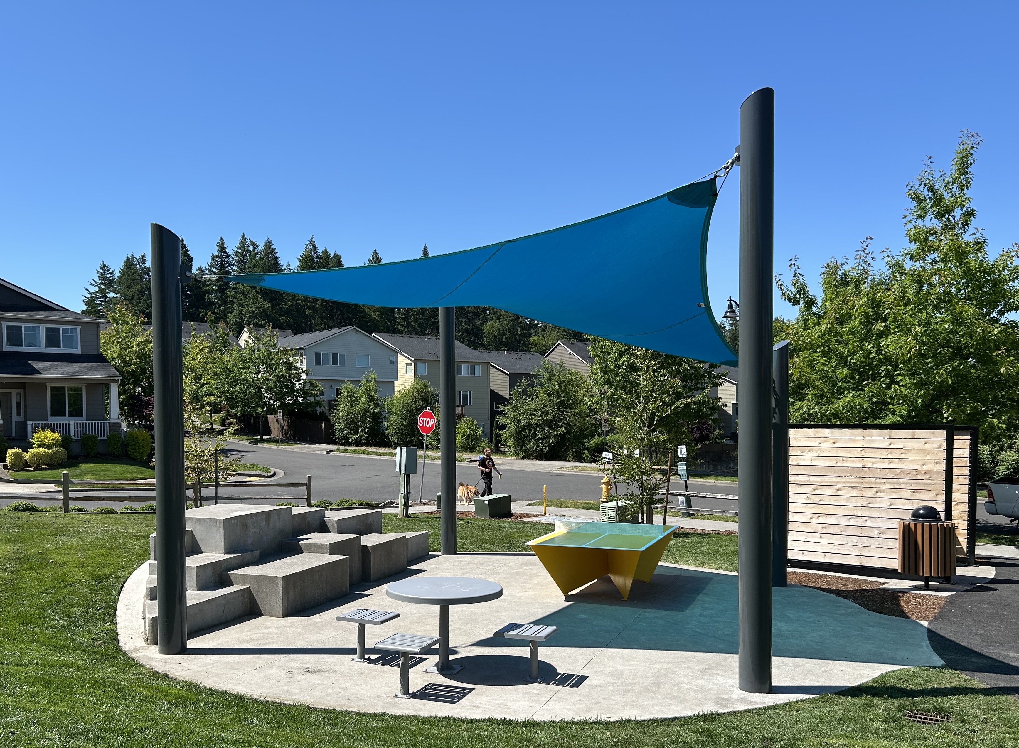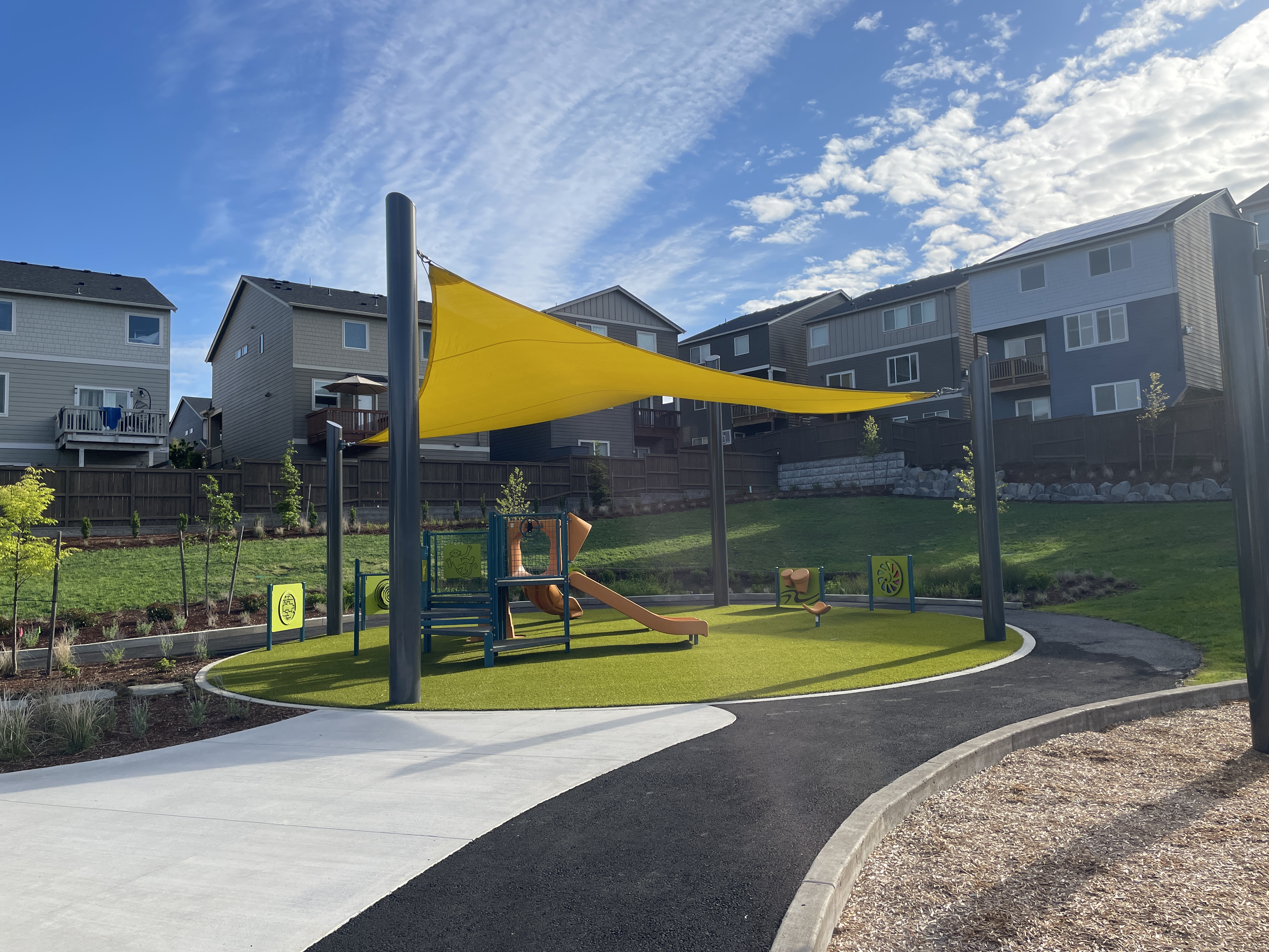 The new shade sail above the play structure area has been temporarily removed. THPRD is working closely with the contractor and manufacturer to re-adjust the sail. Completion of the repair is anticipated later this year.